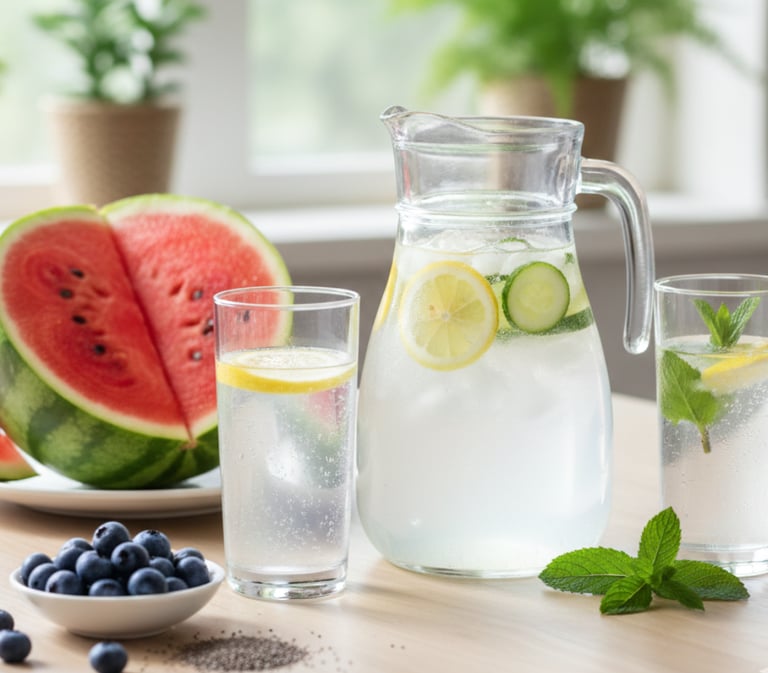 Food Integration: Include 3-5 hydrating foods with every meal for consistent food-based hydration. Focus on variety: leafy greens, cucumbers, tomatoes, berries, melons, bell peppers. Add soups or smoothies 3-4 times weekly for additional fluid intake. Experiment with infused water (cucumber, berries, citrus) if plain water is boring.